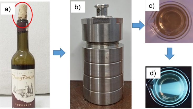Hình 1. Quy trình chế tạo vật liệu C-dots từ nút bấc. (a) Nút bấc từ chai rượu Vang, (b) Nút bấc cắt nhỏ được thủy nhiệt trong bình Teflon, (c) Sản phẩm C-dots dưới ánh sáng mặt trời, (d) Sản phẩm C-dots dưới ánh sáng đèn LED có bước sóng đỉnh ở 415 nm.
