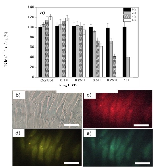 Hình 3. Độc tính tế bào và hình ảnh tế bào khi chụp dưới kính hiển vị huỳnh quang. (a) Tế bào MSCs được nuôi với CDs ở các nồng độ lần lượt là 0, 0,1×, 0,25×, 0,5×, 0,75× và 1× trong thời gian 0, 2, 4 và 6 giờ (1×=0,51 mg.ml-1). Tế bào MSCs sau khi nhuộm với CDs được chụp dưới (b) ánh sáng truyền qua, (c) ánh sáng xanh lục (515-560 nm), (d) ánh sáng xanh lam (450-490 nm), và (e) ánh sáng tím (320-380 nm). Thanh định cỡ là 50 µm.