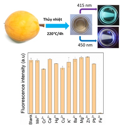 Cũng trong một công bố khác gần đây của nhóm nghiên cứu, kết quả nghiên cứu việc sử dụng hạt cacbon (được chế tạo từ trái trứng gà) làm đầu dò chỉ thị chỉ thị huỳnh quang cho thấy vật liệu này có khả năng phát hiện các ion Fe3+ với ngưỡng thấp nhất là 19,0 µM (hình 4) [8].