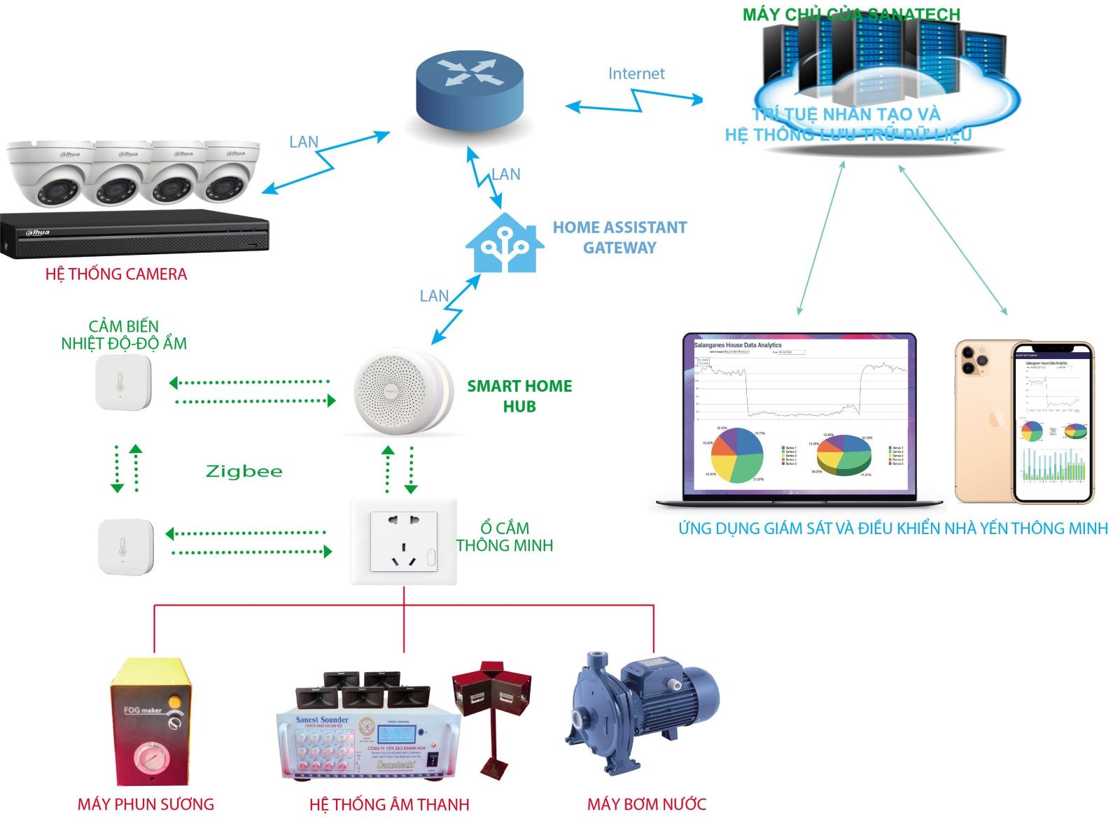 Thiết kế, lắp đặt hệ thống giám sát môi trường và điều khiển các thiết bị của nhà nuôi chim yến: Hệ thống giám sát môi trường bên trong và điều khiển các thiết bị của nhà nuôi chim yến do chúng tôi phát triển có thể kết nối được với các thiết bị IoT phổ biến trên thị trường của nhiều thương hiệu khác nhau (hình 1).