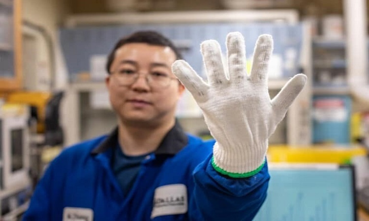 Một thành viên nhóm nghiên cứu đeo găng tay khâu sợi twistron.