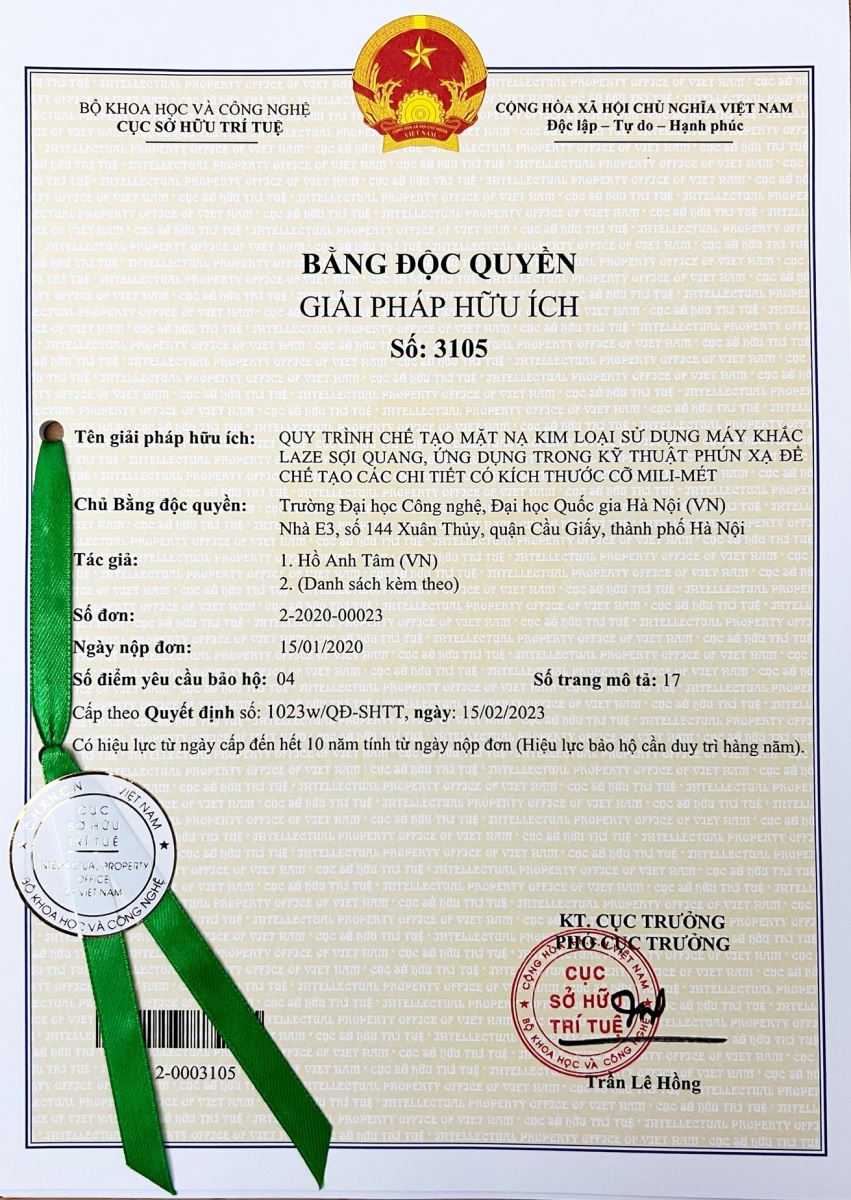 Quy trình được cấp Bằng độc quyền giải pháp hữu ích đề cập đến việc chế tạo các mặt nạ trực tiếp bằng kim loại đơn giản, có độ chính xác cao, có thể chủ động được trong điều kiện thực tế ở nước ta và chi phí trong quá trình chế tạo rất thấp so với các phương pháp truyền thống hiện nay. Giải pháp hữu ích cũng đề xuất quy trình đơn giản để sử dụng các mặt nạ trực tiếp này vào kỹ thuật phún xạ để chế tạo các chi tiết có kích thước mili-mét. Chất lượng của mặt nạ kim loại chế tạo bằng quy trình trên được kiểm chứng bằng thực nghiệm với việc ứng dụng trong nhiều thí nghiệm thực tế cần tới kỹ thuật phún xạ.