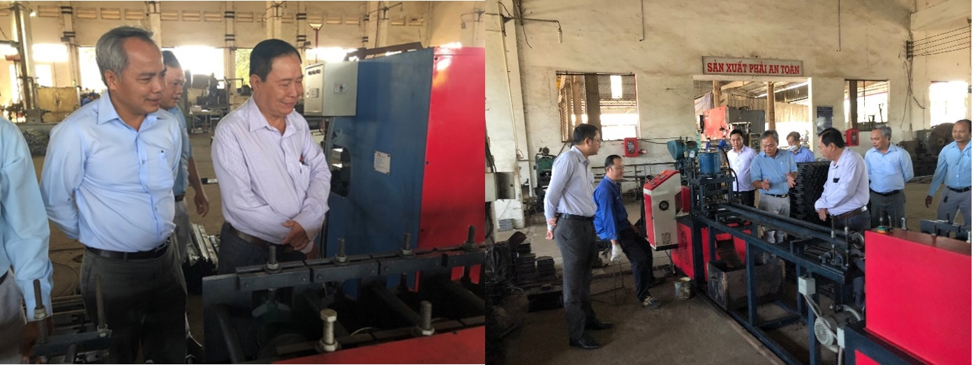 Giám đốc Sở KH&CN Long An - ông Nguyễn Minh Hải (bìa trái) kiểm tra thực tế dây chuyền sản xuất của LICO.