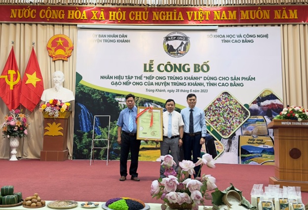 Việc bảo hộ tên của các sản phẩm đặc sản thông qua các hình thức bảo hộ sở hữu công nghiệp (chỉ dẫn địa lý, nhãn hiệu chứng nhận, nhãn hiệu tập thể…) nhằm khai thác sự nổi tiếng là một cách làm hiệu quả hiện nay đang được nhiều địa phương trong cả nước áp dụng để giúp các sản phẩm nổi tiếng khỏi bị lạm dụng danh tiếng trên thị trường trong và ngoài nước. Để bảo vệ quyền và lợi ích hợp pháp cho cộng đồng người dân vùng sản xuất, nâng cao uy tín và danh tiếng của sản phẩm nếp Ong, ngày 30/12/2020, UBND tỉnh đã ban hành Quyết định số 2769/QĐ-UBND về việc phê duyệt dự án “Xây dựng, quản lý và phát triển nhãn hiệu tập thể gạo nếp Ong Trùng Khánh, tỉnh Cao Bằng”. Dự án do Trung tâm Ứng dụng tiến bộ KH&CN chủ trì thực hiện. Sau hơn 2 năm triển khai thực hiện, mặc dù gặp nhiều khó khăn do dịch bệnh Covid-19, đến nay, một trong những kết quả quan trọng của dự án là sản phẩm Nếp Ong của huyện Trùng Khánh đã được Cục Sở hữu trí tuệ cấp Giấy chứng nhận đăng ký nhãn hiệu số 454681 theo Quyết định số 42058/QĐ-SHTT ngày 14/06/2023. Nhãn hiệu do Hội sản xuất và kinh doanh nếp Ong Trùng Khánh là chủ sở hữu.