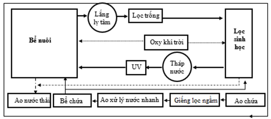 Hình 2. Sơ đồ vận hành hệ thống tuần hoàn nuôi ốc hương (→ Đường nước cấp; → Đường nước tuần hoàn; → Đường nước thải).