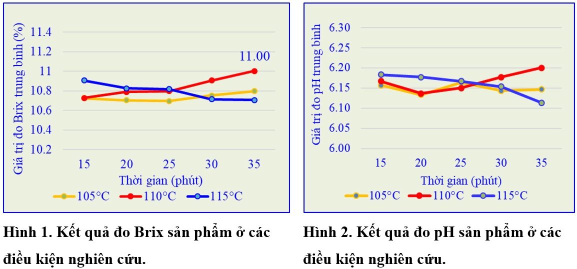 Độ pH: Kết quả bảng 1 cho thấy, ở nhiệt độ 105oC, biến đổi giá trị pH sản phẩm ở các điều kiện nghiên cứu, giá trị pH của sản phẩm có sự dao động nhẹ từ 6,13 đến 6,16. Khi tăng chế độ xử lý nhiệt lên 115oC thì giá trị pH của sản phẩm lại giảm dần, tuy nhiên sự chênh lệch giữa các giá trị ở nhiệt độ 105, 110, 115oC và thời gian 15, 20, 25, 30 và 35 phút là không nhiều. Khi tăng lên nhiệt độ 110oC, giá trị pH có xu hướng tăng dần và đạt giá trị cao nhất là 6,2 tại thời gian 35 phút. Sự khác biệt không đáng kể về chế độ xử lý nhiệt giữa các mẫu ở tất cả các nhiệt độ và thời gian nghiên cứu được khảo sát. Như vậy, về chỉ tiêu đánh giá cảm quan ưa thích, ở chế độ xử lý nhiệt 110oC trong 35 phút, sản phẩm có độ pH 6,20 được chọn (hình 2).