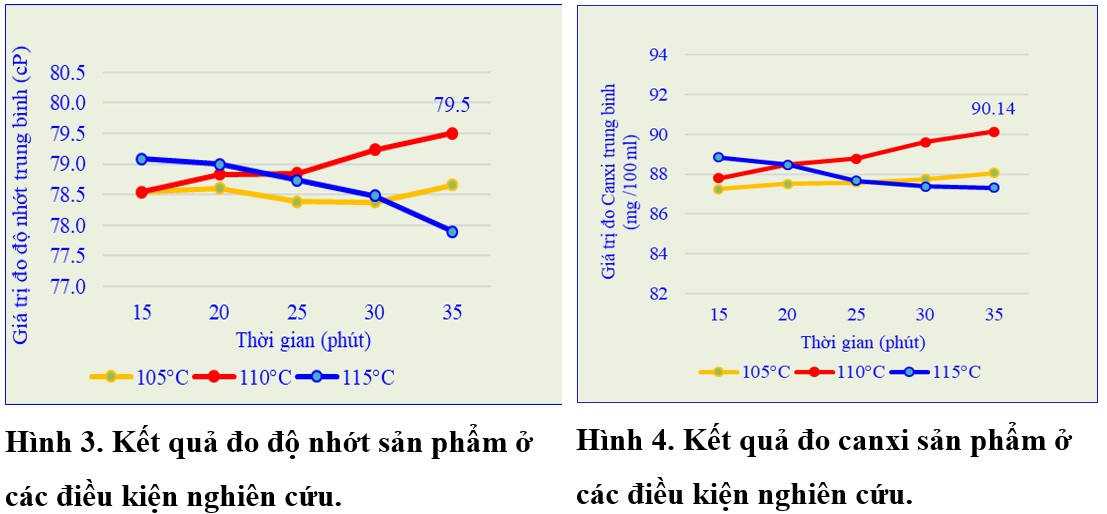 Canxi: Canxi của sản phẩm tăng dần và đạt giá trị cao nhất tương ứng với 110oC/35 phút. Giá trị canxi giảm dần và đạt giá trị thấp ở 115oC/35 phút. Kết quả bảng 1 cho thấy, không có sự khác biệt đáng kể về giá trị canxi của sản phẩm ở 105, 115oC, trong 15 đến 35 phút, ngoại trừ 110oC. Như vậy có thể thấy, đối với chỉ tiêu đánh giá cảm quan về độ ưa thích, ở chế độ xử lý nhiệt 110oC trong 35 phút sản phẩm có hàm lượng canxi tối ưu nhất là 90,14±0,06 mg/100 ml (hình 4).