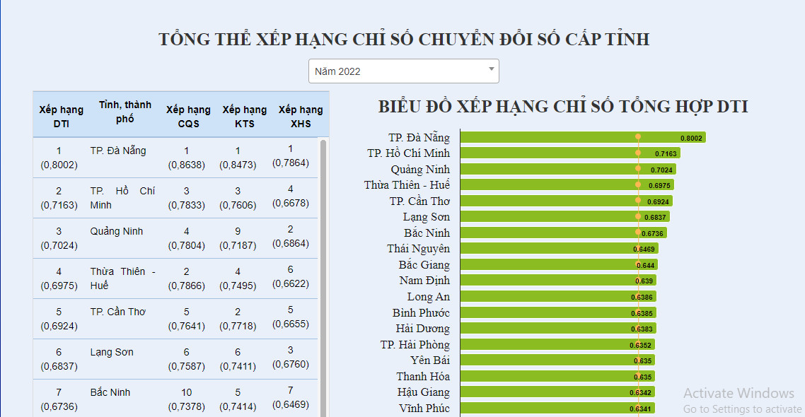 So với năm 2021, tốc độ tăng trưởng chỉ số chuyển đổi số quốc gia năm 2022 có chậm lại, nhưng các chỉ số thành phần về chính phủ số, kinh tế số và xã hội số vẫn duy trì tốc độ tăng trưởng cao (45-55%). Điều này có nghĩa là càng lên mức cao, thì việc tăng điểm sẽ càng khó khăn. Chỉ số tổng hợp cấp tỉnh có mức tăng trưởng mạnh hơn chỉ số tổng hợp cấp bộ. Năm 2022, 100% các bộ, địa phương đều có chỉ số tăng so với năm 2021, điều này phản ánh một cách tương đối trong năm 2022, cả hệ thống chính quyền các cấp đều nỗ lực, nhưng mức độ nỗ lực khác nhau sẽ có kết quả khác nhau.