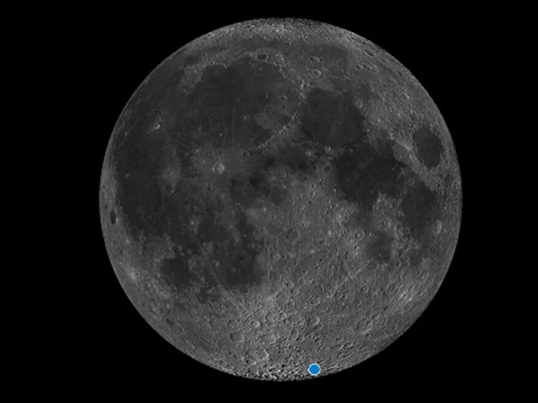 Địa điểm hạ cánh chính của Chandrayaan-3 nằm ở vùng cực nam, gần phía dưới - bên phải của Mặt trăng khi nhìn từ Trái đất. Nguồn: NASA.
