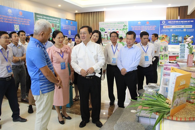 Bộ trưởng Bộ KH&CN Huỳnh Thành Đạt cùng các đại biểu tham quan sản phẩm trưng bày tại hội nghị.