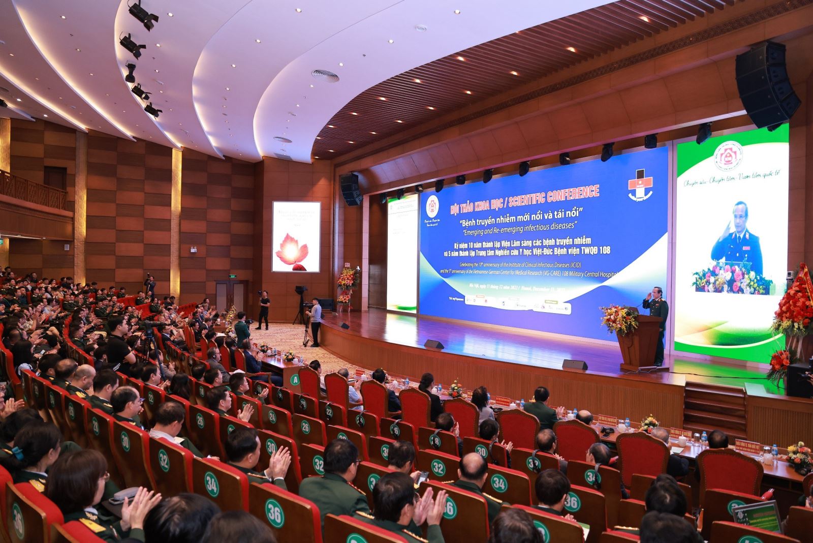 Phát biểu tại hội thảo, Thứ trưởng Bộ Y tế, GS.TS Trần Văn Thuấn đánh giá cao những kết quả đạt được của Viện Lâm sàng các bệnh truyền nhiễm nói riêng và Bệnh viện Trung ương Quân đội 108 nói chung trong công tác khám chữa bệnh thời gian vừa qua. Thứ trưởng Trần Văn Thuấn chia sẻ, trên thế giới, khu vực và Việt Nam, dịch bệnh luôn diễn biến phức tạp và tiềm ẩn nguy cơ xuất hiện các dịch bệnh mới nổi, tái nổi. Chính vì vậy, việc Bệnh viện Trung ương Quân đội 108 tổ chức Hội thảo về bệnh truyền nhiễm mới nổi và tái nổi là hết sức cần thiết. Đây là cơ hội tốt để các nhà khoa học trao đổi, học hỏi, cập nhật những kiến thức, kinh nghiệm của các quốc gia trên thế giới. Đồng thời, thay mặt lãnh đạo Bộ Y tế, Thứ trưởng Trần Văn Thuấn cũng gửi lời cảm ơn sự hợp tác giúp đỡ của bạn bè quốc tế và bày tỏ mong muốn tiếp tục nhận được sự hợp tác giúp đỡ của các nước, để y học Việt Nam từng bước tiếp cận trình độ khoa học và công nghệ trong khu vực và trên thế giới.