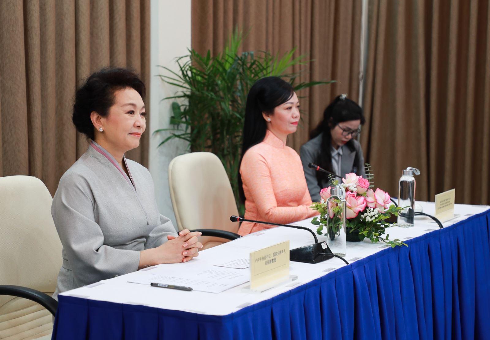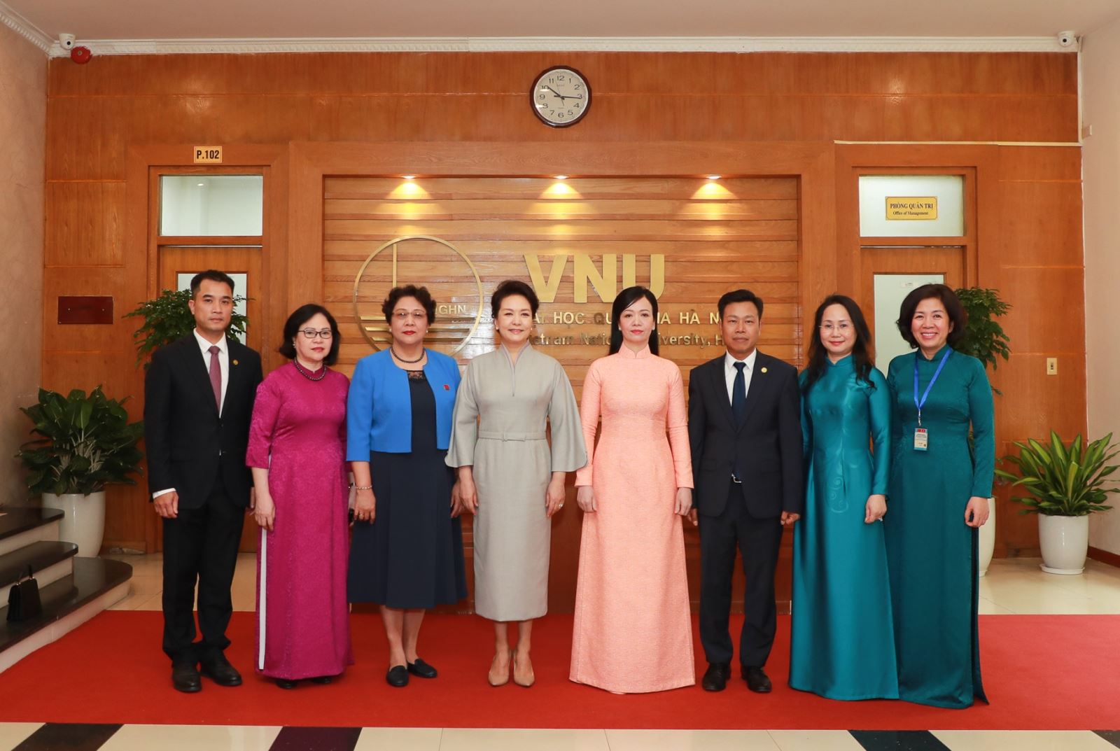 Tham dự buổi đón tiếp Phu nhân Chủ tịch nước Trung Quốc và Việt Nam có bà Lâm Thị Phương Thanh - Ủy viên Trung ương Đảng, Phó Chánh Văn phòng Thường trực Văn phòng Trung ương Đảng; Phó Trưởng ban thường trực Ban đối ngoại Trung ương Nguyễn Thị Hoàng Vân, Phó Chủ nhiệm Văn phòng Chủ tịch nước Phan Thị Kim Oanh, Thứ trưởng Bộ Giáo dục và Đào tạo Ngô Thị Minh. Về phía ĐHQGHN có Giám đốc Lê Quân, Phó Giám đốc Phạm Bảo Sơn cùng lãnh đạo Văn phòng, các ban chức năng, Lãnh đạo Trường Đại học Khoa học Xã hội và Nhân văn và Trường Đại học Ngoại ngữ.