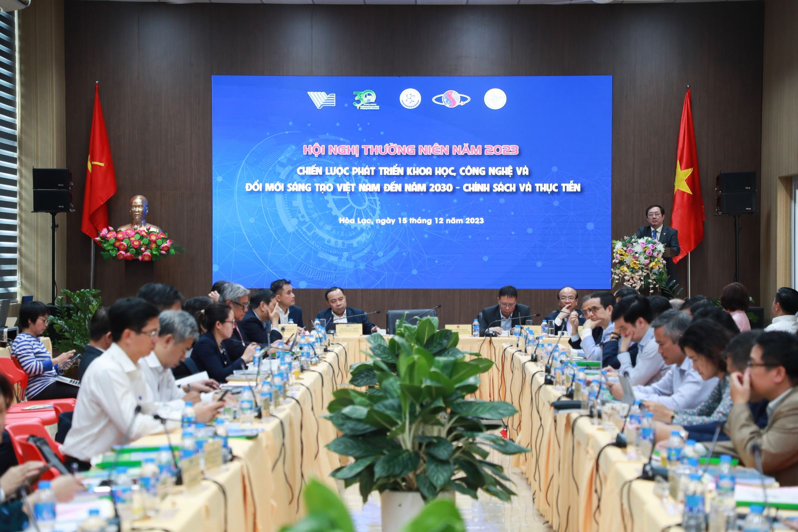Ngày 15/12/2023, tại Hòa Lạc, Bộ KH&CN phối hợp với Đại học Quốc gia Hà Nội (VNU), Đại học Quốc gia TP Hồ Chí Minh (VNUHCM), Viện Hàn lâm KH&CN Việt Nam (VAST), Viện Hàn lâm Khoa học Xã hội Việt Nam (VASS) tổ chức Hội nghị thường niên năm 2023 với chủ đề “Chiến lược phát triển KH,CN&ĐMST Việt Nam đến năm 2030 - Chính sách và thực tiễn”. Bộ trưởng Bộ KH&CN Huỳnh Thành Đạt, Chủ tịch VAST Châu Văn Minh, Giám đốc VNUHCM Vũ Hải Quân, Chủ tịch VASS Phan Chí Hiếu, Phó Giám đốc VNU Phạm Bảo Sơn đồng chủ trì hội nghị.