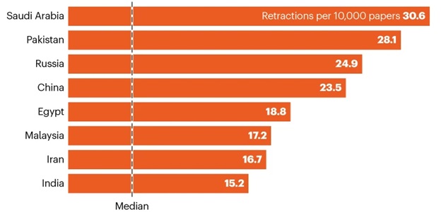 Trong số các quốc gia đã xuất bản hơn 100.000 bài báo trong hai thập kỷ qua, phân tích của Nature cho thấy Ả Rập Saudi có tỷ lệ rút lại cao nhất, 30/10.000 bài báo (không bao gồm số lần rút lại của các tài liệu hội nghị).