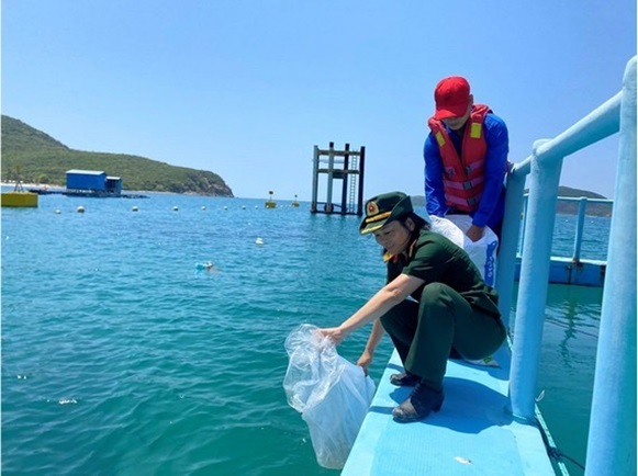 Nhóm nghiên cứu thả con giống do dự án sản xuất tại vịnh Nha Trang.