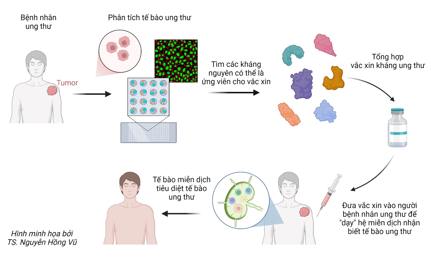 Hình 1. Quy trình chế tạo vắc-xin điều trị ung thư. Mẫu mô chứa tế bào ung thư được phân tích trong phòng thí nghiệm bằng kỹ thuật sinh học phân tử và tế bào để tìm ra các protein có thể đóng vai trò làm kháng nguyên để điều chế vắc-xin. Sau khi vắc-xin ung thư được đưa vào người bệnh, chúng sẽ dạy hệ miễn dịch nhận biết tế bào ung thư như thế nào. Từ đó, các tế bào miễn dịch sẽ tìm kiếm, tấn công và tiêu diệt các tế bào ung thư trong cơ thể người bệnh (Hình minh họa bởi TS Nguyễn Hồng Vũ).