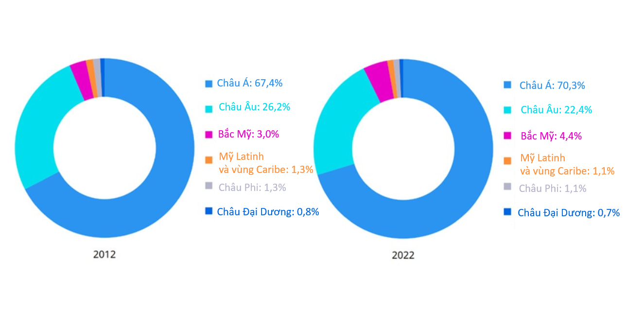 Nếu tính theo khu vực, châu Á chiếm 70,3% tổng số kiểu dáng trong đơn đăng ký được nộp trên toàn thế giới vào năm 2022. Tiếp theo là Châu Âu (22,4%) và Bắc Mỹ (4,4%). Tỷ trọng tổng hợp của châu Phi, châu Mỹ Latinh và Caribe và châu Đại Dương là 2,9% vào năm 2022. Hai khu vực có mức tăng trung bình đáng kể nhất trong giai đoạn 2012-2022 là Bắc Mỹ và châu Á - hình 2.