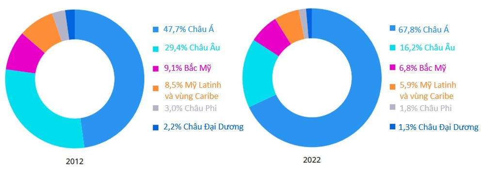Hình 3. Số lượng đơn đăng ký nhãn hiệu theo khu vực năm 2012 và 2022.