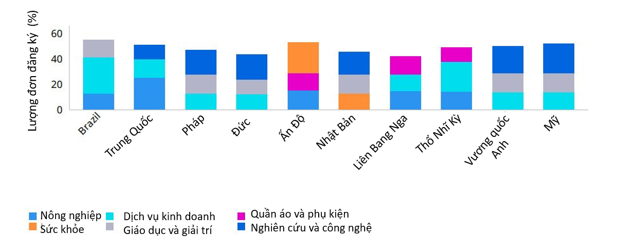Điều đáng chú ý là tại các quốc gia có số lượng đơn đăng ký nhãn hiệu hàng đầu, sự phân bố về ngành nghề khá khác nhau (hình 4), ví dụ như Ấn Độ đăng ký nhãn hiệu liên quan tới các sản phẩm chăm sóc sức khỏe đứng hàng đầu, nhưng lại không có sự xuất hiện (hoặc rất ít) đơn đăng ký liên quan tới giáo dục và giải trí. Trong khi đó, tại Mỹ, Vương quốc Anh hay Pháp lĩnh vực này lại thu hút sự quan tâm khá lớn.