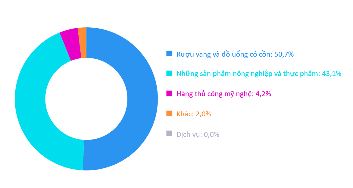 Chỉ dẫn địa lý có hiệu lực liên quan đến rượu vang và đồ uống có cồn (50,7%) chiếm một nửa tổng số toàn cầu vào năm 2022, trong khi nông sản và thực phẩm chiếm 43,1%, thủ công mỹ nghệ chiếm 4,2% - hình 3.