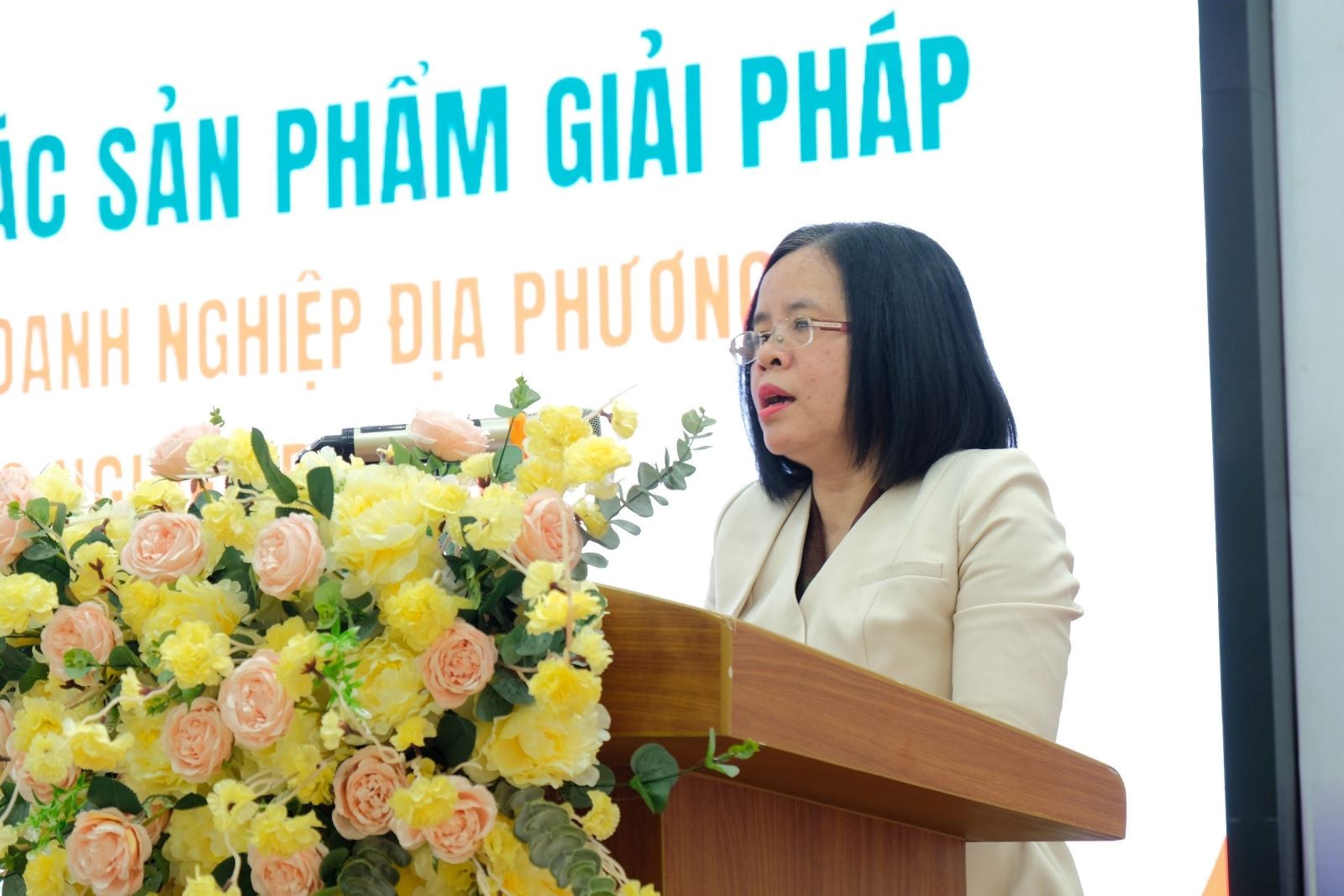 Phó Giám đốc phụ trách Trung tâm Phát triển Khoa học - công nghệ và Đổi mới sáng tạo Nguyễn Thị Cẩm Hương phát biểu tại hội nghị.