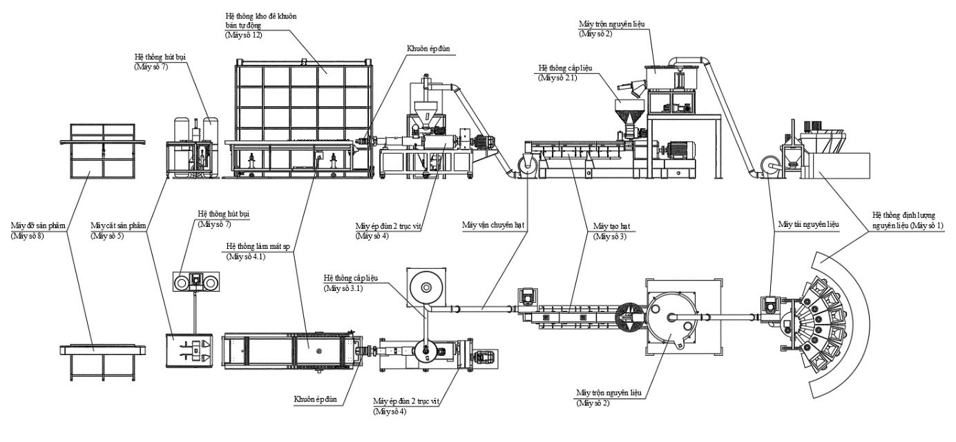 Sơ đồ bố trí các máy trên dây chuyền sản xuất gỗ nhựa được mô phỏng bằng phần mềm.