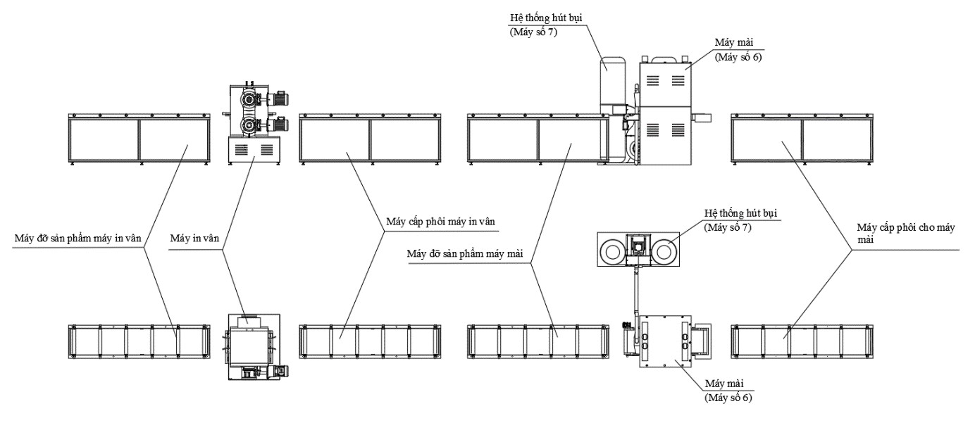 Dây chuyền sản xuất được chia thành 2 nhóm máy: tạo hình (hình 2) và tạo họa tiết (hình 3). Mỗi nhóm máy sẽ gồm các máy chính và máy phụ trợ. Máy chính có chức năng gia công sản xuất chính, máy phụ trợ đi theo thay thế con người thực hiện các chức năng hỗ trợ cho máy chính như: vận chuyển sản phẩm, hỗ trợ gia công, tăng độ chính xác cho máy chính, hút bụi, làm mát…