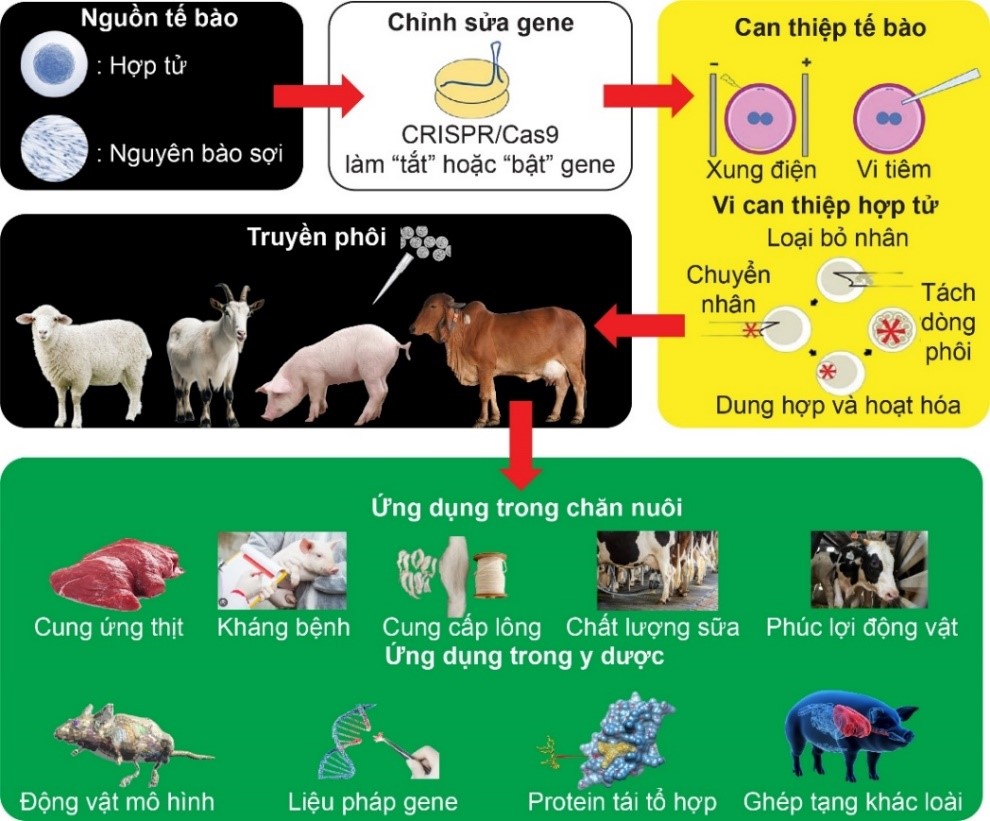 Chỉnh sửa gen là một trong những công cụ can thiệp vào vật chất di truyền, đã mở ra “cánh cửa” mới trong lĩnh vực chăn nuôi và bảo tồn động vật. Thông qua khả năng cắt gen chính xác, các hệ thống chỉnh sửa sử dụng enzyme cắt DNA ngón tay kẽm (Zinc finger nuclease, ZFN), enzyme cắt DNA giống yếu tố hoạt hóa phiên mã (Transcription activator - like effector nucleases, TALEN) và enzyme cắt DNA gắn vào nhóm các trình tự lặp lại (CRISPR/Cas) [3] hứa hẹn tạo ra các dòng đột biến có khả năng thích nghi với điều kiện môi trường khắc nghiệt, cải thiện chất lượng sản phẩm thịt, sữa, kiểm soát dịch hại cũng như tạo ra các mô hình chỉnh sửa gen động vật cỡ nhỏ cho những nghiên cứu cơ bản [2, 4, 5].