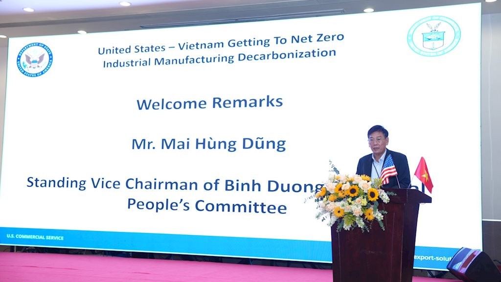 Phát biểu tại hội thảo, Phó Chủ tịch Thường trực UBND tỉnh Bình Dương Mai Hùng Dũng đã chia sẻ về những nỗ lực của tỉnh Bình Dương để thích nghi với biến động do các yếu tố địa chính trị và Cách mạng công nghiệp 4.0 gây ra. Bình Dương đang phát triển một hệ sinh thái kiểu mới, bổ sung cho mô hình công nghiệp - đô thị - dịch vụ, bao gồm: hệ sinh thái khoa học, công nghệ và đổi mới sáng tạo; xây dựng các khu công nghiệp thông minh và đô thị thông minh sinh thái để đảm bảo phát triển bền vững. Ông nhấn mạnh, tỉnh cam kết tham gia tích cực vào mục tiêu phát thải ròng bằng 0 vào năm 2050, đồng thời hướng tới xây dựng động lực phát triển kinh tế mới, thay thế cho thâm dụng lao động và thâm dụng đất đai. Đồng thời, bài toán hướng tới phát thải ròng bằng 0 không chỉ giải quyết vấn đề môi trường và phát triển bền vững, mà còn là một thách thức đánh giá năng lực quản trị của địa phương. Bình Dương, với vai trò là trung tâm sản xuất lớn của Việt Nam, cam kết đóng góp sâu rộng vào quá trình này, mong muốn góp phần xây dựng một tương lai bền vững không chỉ cho Việt Nam mà còn cho thế giới.