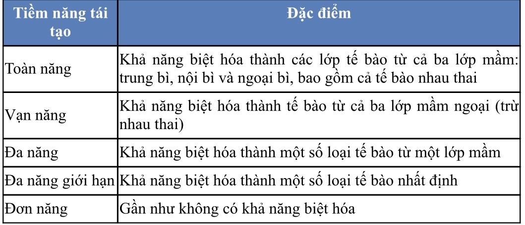 Bảng phân loại tế bào gốc theo tiềm năng tái tạo.