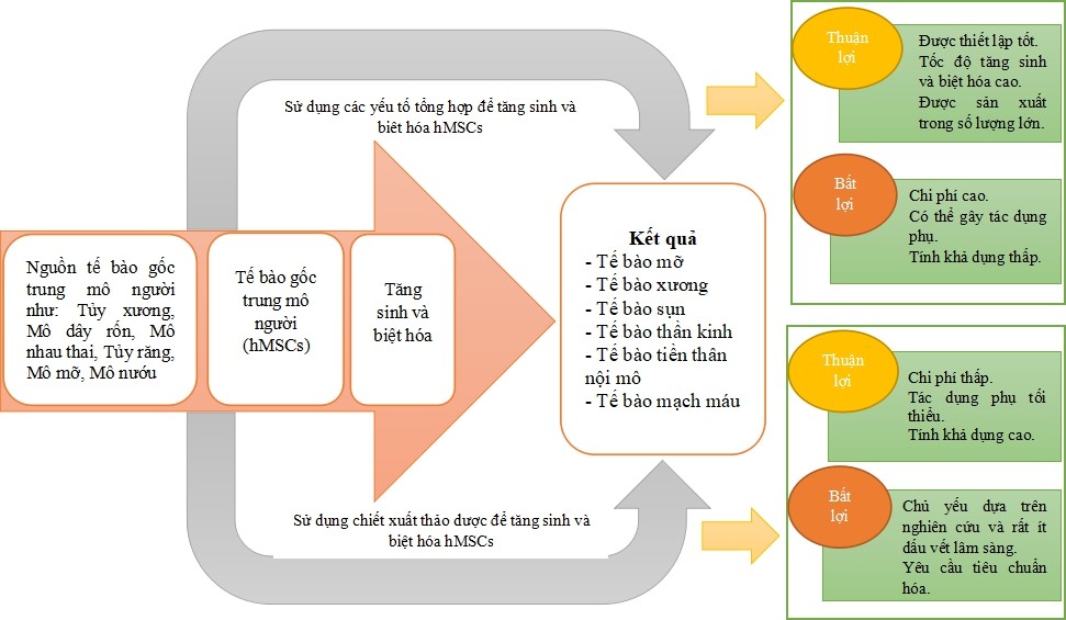 Các nguồn tế bào gốc trung mô người (hMSC) và khả năng biệt hóa đối với kích thích bằng chiết xuất thảo dược và các chất kích thích tổng hợp. (Nguồn: Udalamaththa et al)2.