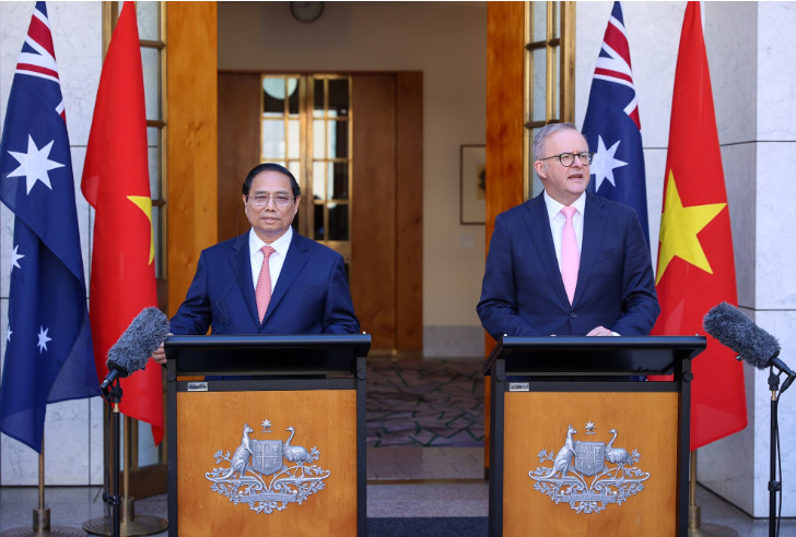 Thủ tướng Phạm Minh Chính và Thủ tướng Australia Anthony Albanese thông báo nâng cấp quan hệ Việt Nam - Australia lên mức cao nhất - quan hệ Đối tác Chiến lược toàn diện (ảnh: VGP/Nhật Bắc).