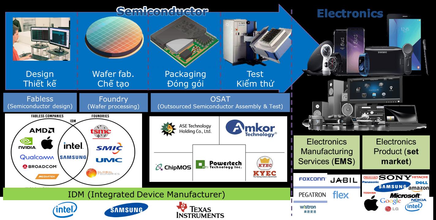 Việt Nam đứng thứ 9 toàn cầu trong lĩnh vực xuất khẩu hàng điện tử, được đánh giá là có hệ sinh thái bán dẫn phát triển nhanh, tiềm năng trong chuỗi cung ứng bán dẫn toàn cầu. Các doanh nghiệp Việt như Viettel, FPT đã bắt đầu tham gia vào chuỗi cung ứng IC toàn cầu. Nhà máy đóng gói và kiểm định của Intel tại TP Hồ Chí Minh đến cuối năm 2022 đã xuất xưởng hơn 3 tỷ chip và có kế hoạch tiếp tục đầu tư trong thời gian tới. Bên cạnh đó, hiện chúng ta có khoảng hơn 5.000 kỹ sư thiết kế vi mạch3. Các doanh nghiệp thuộc chuỗi cung ứng bán dẫn toàn cầu đã, đang và tiếp tục đầu tư vào Việt Nam như Amkor, Marvell, Sysnosys, Infineon Technologies, Hana Micron, Samsung... Tháng 9/2023, tại Hà Nội, Hiệp hội bán dẫn Đông Nam Á (thành viên của Hiệp hội bán dẫn toàn cầu) đã tổ chức Hội nghị thượng đỉnh Kinh doanh Việt Nam 2023: Kết nối Việt Nam với hệ sinh thái bán dẫn Đông nam Á. Hội nghị thu hút đông đảo doanh nghiệp trong hệ sinh thái bán dẫn toàn cầu tới tìm hiểu và tìm kiếm cơ hội đầu tư tại Việt Nam. Bên cạnh đó, cuối năm 2023, Việt Nam và Mỹ đã nâng cấp quan hệ lên Đối tác chiến lược toàn diện trong chuyến thăm chính chức Việt Nam của Tổng thống Mỹ Joe Biden; Thủ tướng Việt Nam cũng đã đi thăm một số công ty bán dẫn lớn tại Mỹ và các công ty này đã bày tỏ mong muốn giúp Việt Nam trở thành một trung tâm sản xuất chip bán dẫn lớn.