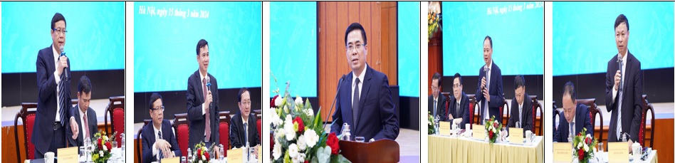 Các Thứ trưởng Lê Xuân Định, Bùi Thế Duy, Nguyễn Hoàng Giang, Trần Hồng Thái, Hoàng Minh (từ trái sang phải) chia sẻ ý kiến tại Hội nghị.