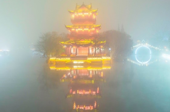 Tháp Trấn Hải cổ kính ở Hoài An, Trung Quốc bị bao phủ trong “sương mù” do ô nhiễm không khí gây nên (ảnh: Costfoto/Nurphoto).