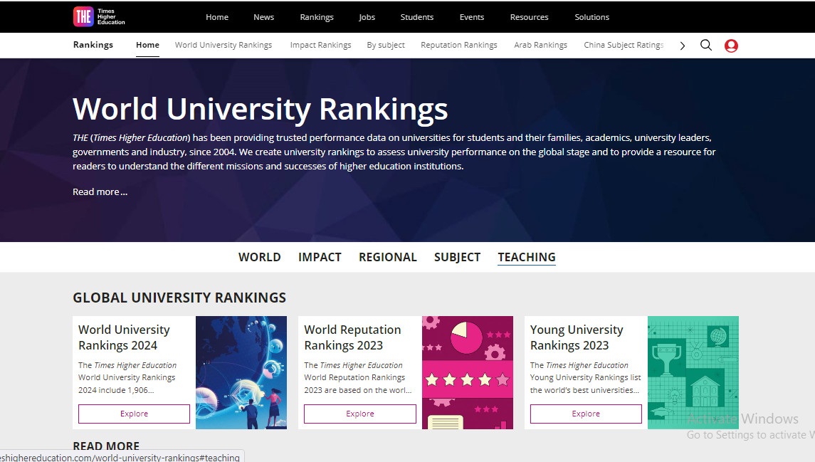 Trang chủ của bảng xếp hạng đại học THE.