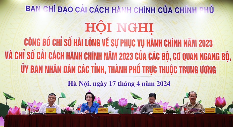 Bộ trưởng Bộ Nội vụ Phạm Thị Thanh Trà (thứ hai từ trái sang) và các đồng chí chủ trì Hội nghị công bố Chỉ số hài lòng về sự phục vụ hành chính năm 2023 và Chỉ số CCHC năm 2023 của các bộ/ngành, UBND các tỉnh/thành phố trực thuộc Trung ương (ảnh: MOHA).