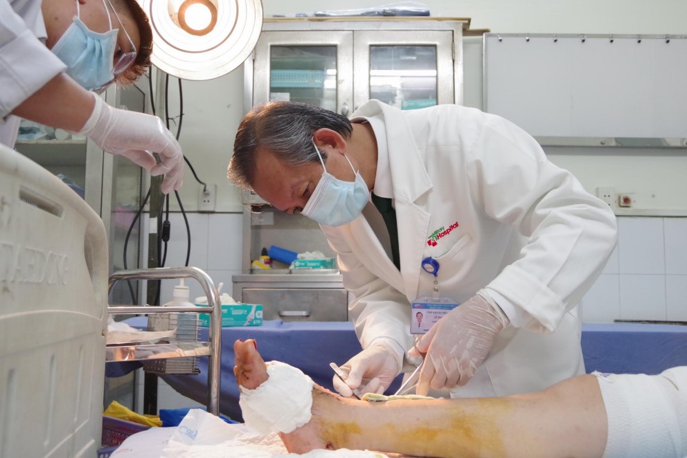 PGS.TS.BS.TTND Lê Quang Trí - Giám đốc Bệnh viện Quân y 7A kiểm tra bệnh nhân sau khi mổ ghép da kết hợp thoa gel protein.
