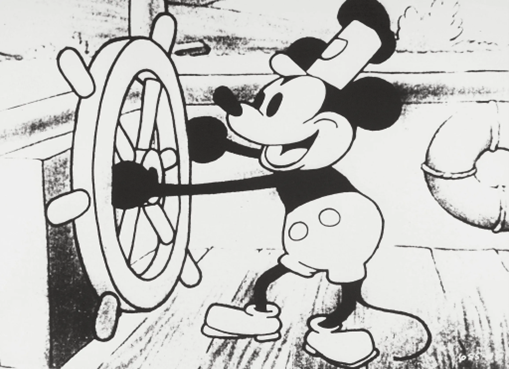 Trong khi đó, chuột Mickey ra mắt công chúng lần đầu tiên năm 1928 trong bộ phim hoạt hình “Steamboat Willie”. Bộ phim này chỉ kéo dài trong khoảng 7 phút và không có lời thoại, độ chi tiết trong câu chuyện gốc không thể so sánh bằng những tác phẩm văn học. Điều này đòi hỏi tác giả sáng tác các tác phẩm phái sinh phải đầu tư và tự viết một câu chuyện, chủ đề hoàn toàn mới dựa trên sức sáng tạo của bản thân nếu muốn khai thác hiệu quả chuột Mickey, không thể “dựa hơi” được tác phẩm gốc nhiều như trường hợp của 2 tiền bối kể trên.