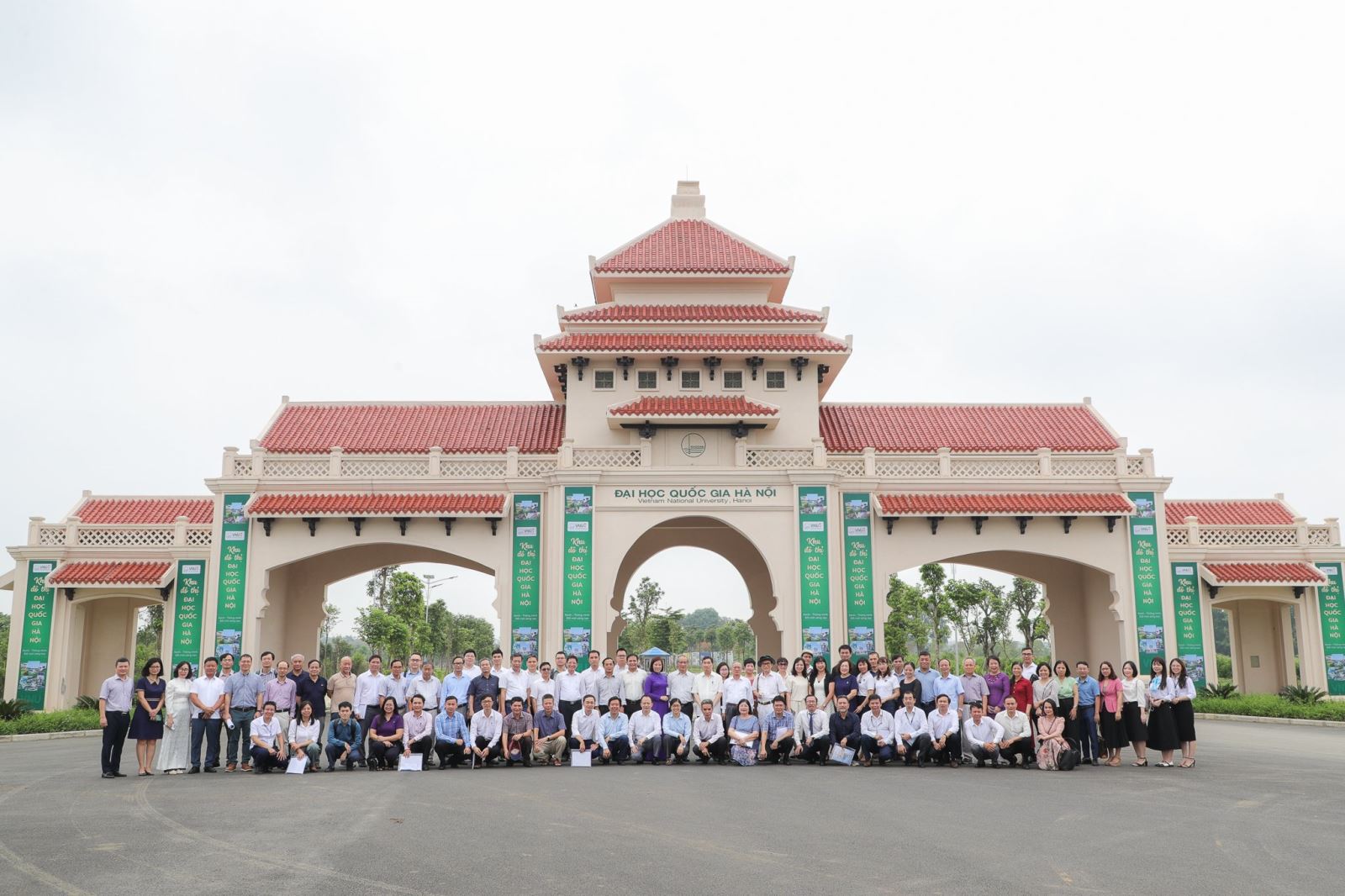 Lãnh đạo và các nhà khoa học của Đại học Quốc gia Hà Nội chụp ảnh lưu niệm tại cổng chính của Khu đô thị Đại học Quốc gia Hà Nội tại Hòa Lạc.