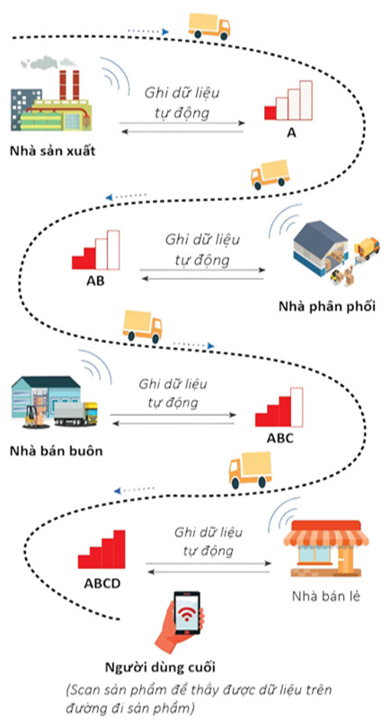 Dữ liệu hành trình của sản phẩm: Qua đường đi của sản phẩm, dữ liệu (A, AB, ABC, ABCD) sẽ được ghi, tự động cập nhật thông tin của sản phẩm đến tay người tiêu dùng.