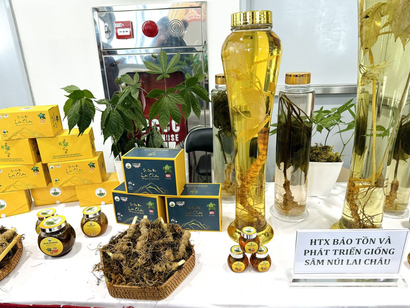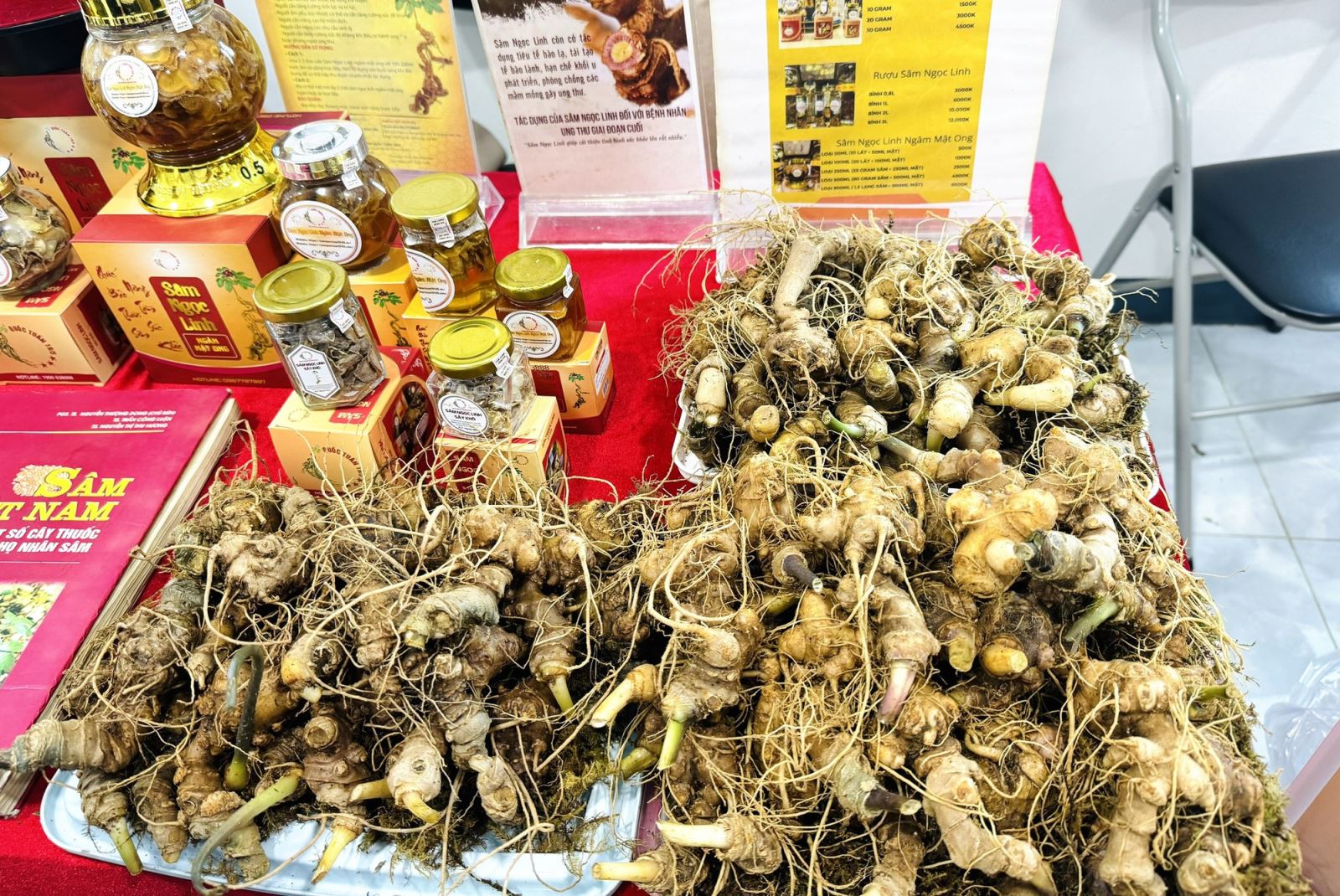 Các sản phẩm từ sâm Ngọc Linh (trái) và sâm Lai Châu (phải) được trưng bày tại Hội thảo “Tiêu chuẩn chất lượng dược liệu sâm (Panax spp) và sản phẩm chăm sóc sức khỏe từ sâm” tổ chức ngày 27/06/2024 tại Hà Nội.