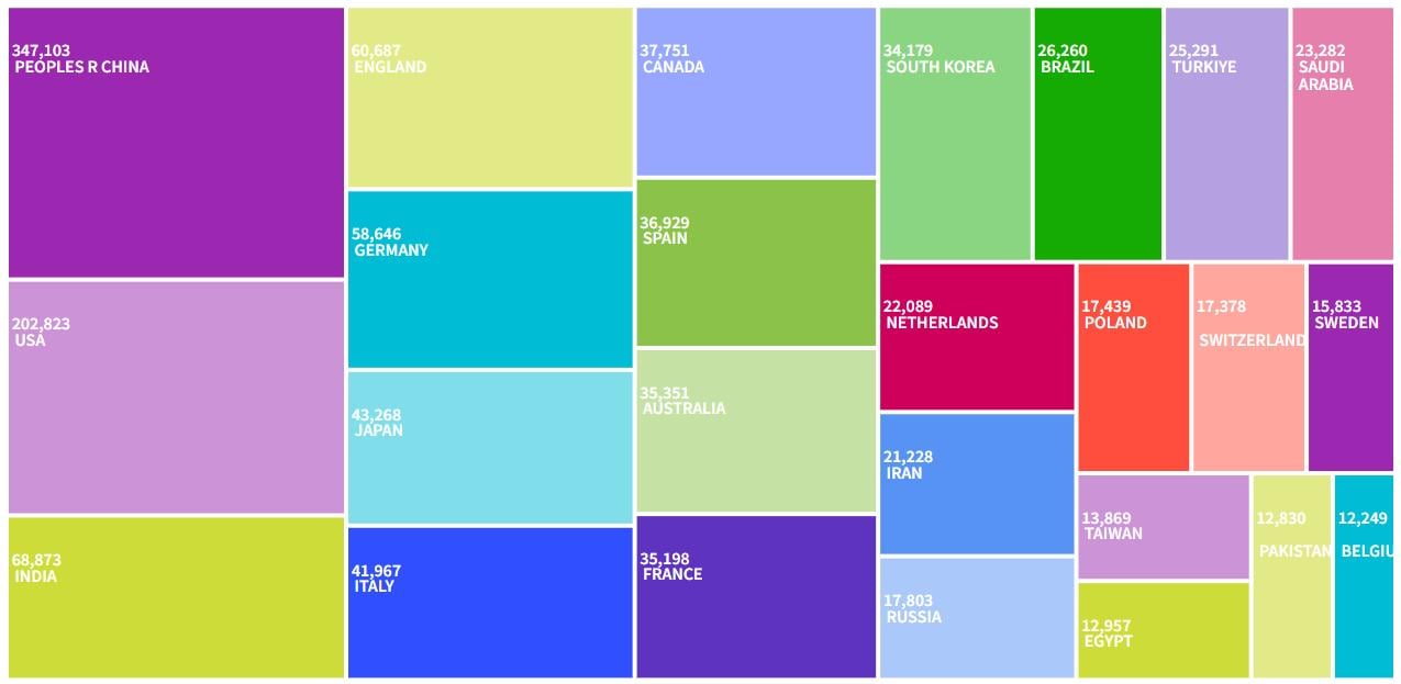 Thành tựu bài báo nghiên cứu của Top 25 nước trên thế giới, ảnh chụp từ WoS lúc 11:00 giờ ngày 17/07/2024.