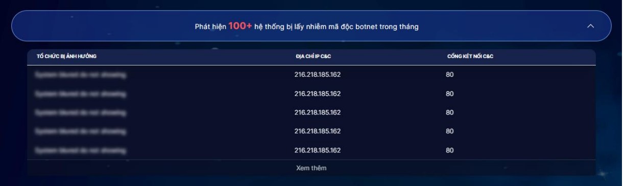 Thực hiện việc phân tích và phát hiện sớm các nguy cơ từ bên trong hệ thống, đặc biệt là các nguy cơ máy chủ, máy trạm trong hệ thống nhiễm mã độc, trở thành botnet. Hệ thống giám sát của NCSC đã thực hiện thu thập chia sẻ thông tin về các mối đe dọa trên không gian mạng với các tổ chức quốc tế, giám sát liên tục các mạng lưới botnet. Tháng 6/2024, NCSC phát hiện 11 hệ thống của các đơn vị có kết nối đến hạ tầng botnet. NCSC đã thực hiện chia sẻ các thông tin botnet này đến các đơn vị thông qua hệ thống phát hiện cảnh báo sớm botnet.
