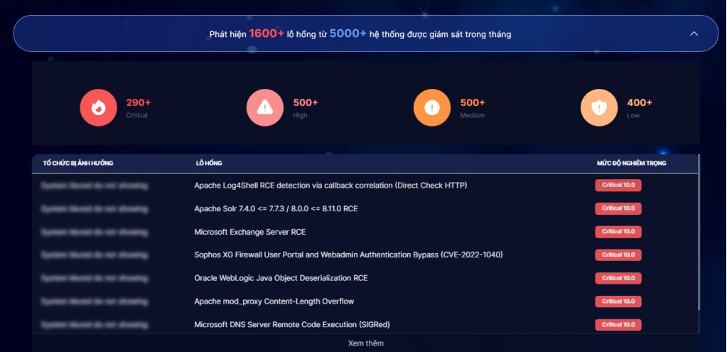 Tháng 6/2024, hệ thống giám sát, rà quét từ xa của NCSC cũng đã phát hiện hơn 1.600 lỗ hổng trên 5.000 hệ thống đang mở công khai trên Internet. NCSC cũng đã ghi nhận 12 lỗ hổng mới được công bố, có mức độ ảnh hưởng nghiêm trọng/cao có thể bị lợi dụng để tấn công, khai thác vào các hệ thống của các cơ quan, tổ chức. Đây là các lỗ hổng tồn tại trên các sản phẩm phổ biến của nhiều cơ quan, tổ chức, doanh nghiệp.