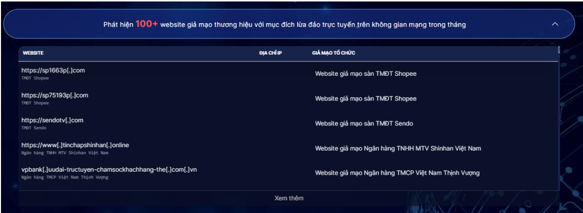 NCSC cũng đã ghi nhận 124.928 địa chỉ website giả mạo cơ quan, tổ chức. Các đối tượng sử dụng website giả mạo này để lừa đảo, gây thiệt hại cho người dân trên không gian mạng, đồng thời gây thiệt hại nghiêm trọng đến uy tín, thương hiệu của chính cơ quan, tổ chức bị giả mạo. Trong tháng 6/2024, hệ thống của NCSC đã phát hiện 68 website giả mạo thương hiệu với mục đích lừa đảo được phát tán trên không gian mạng.